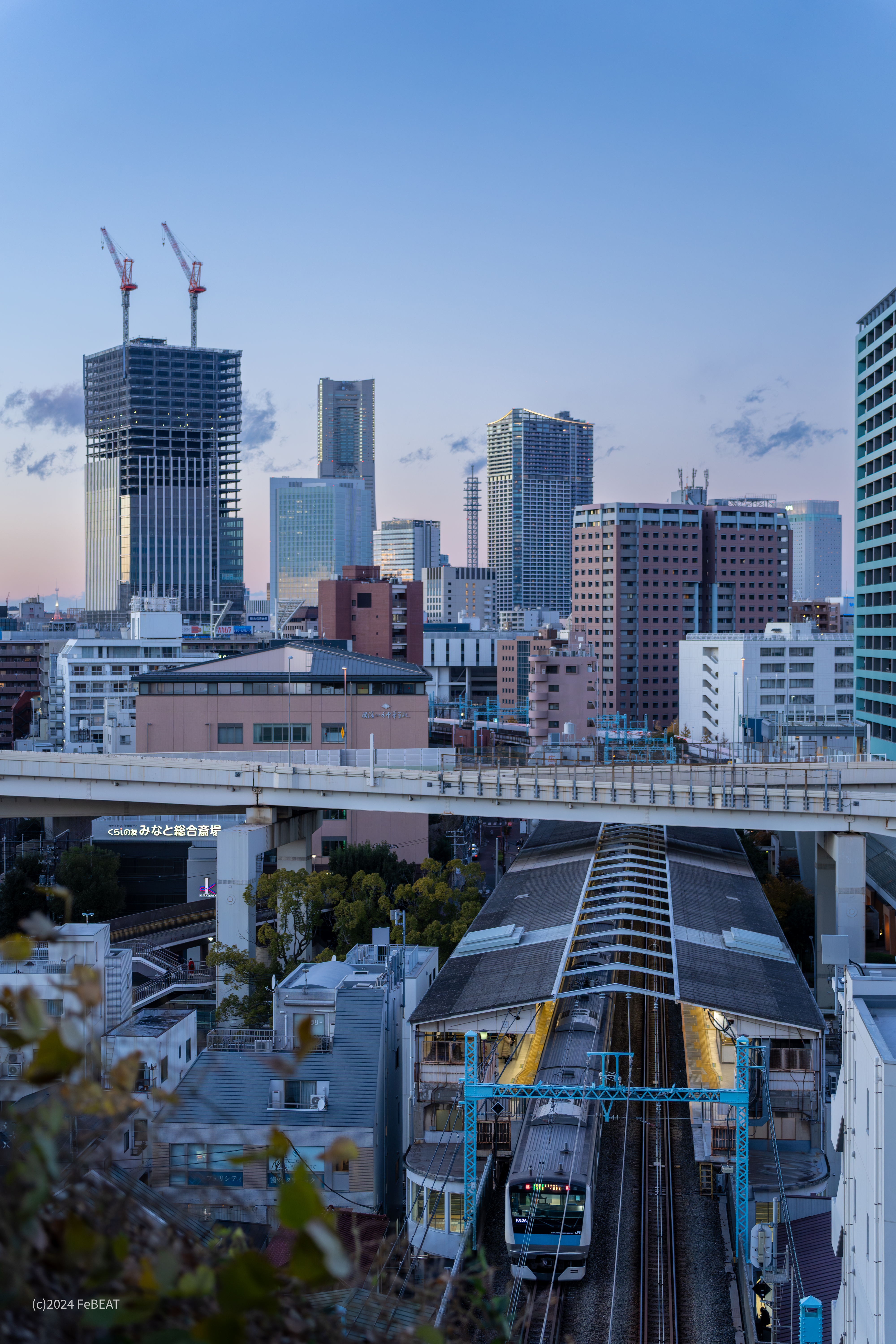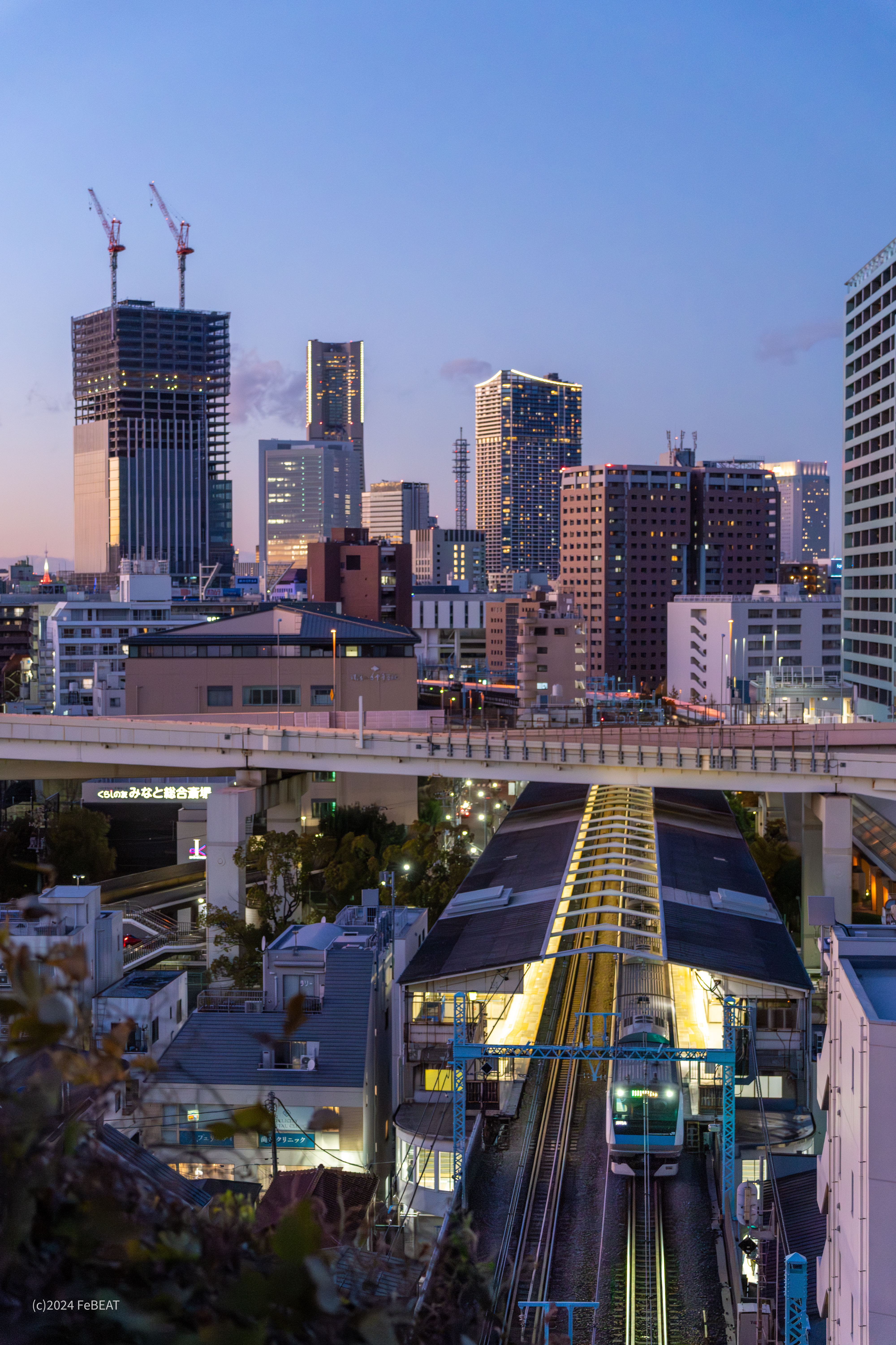 遠くにランドマークタワーも望める、山手イタリア庭園からの横浜の夕景。日没直後、暗くなった空に街の灯りが浮かびはじめ、動き出した列車の前照灯にレールが光ります。