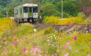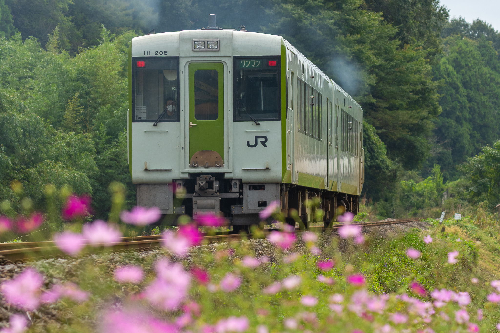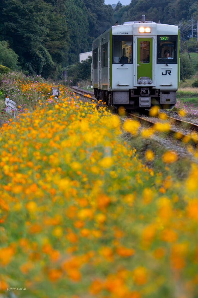 コスモスと列車のバランス、花のかかり具合に悩みながら撮影しました。