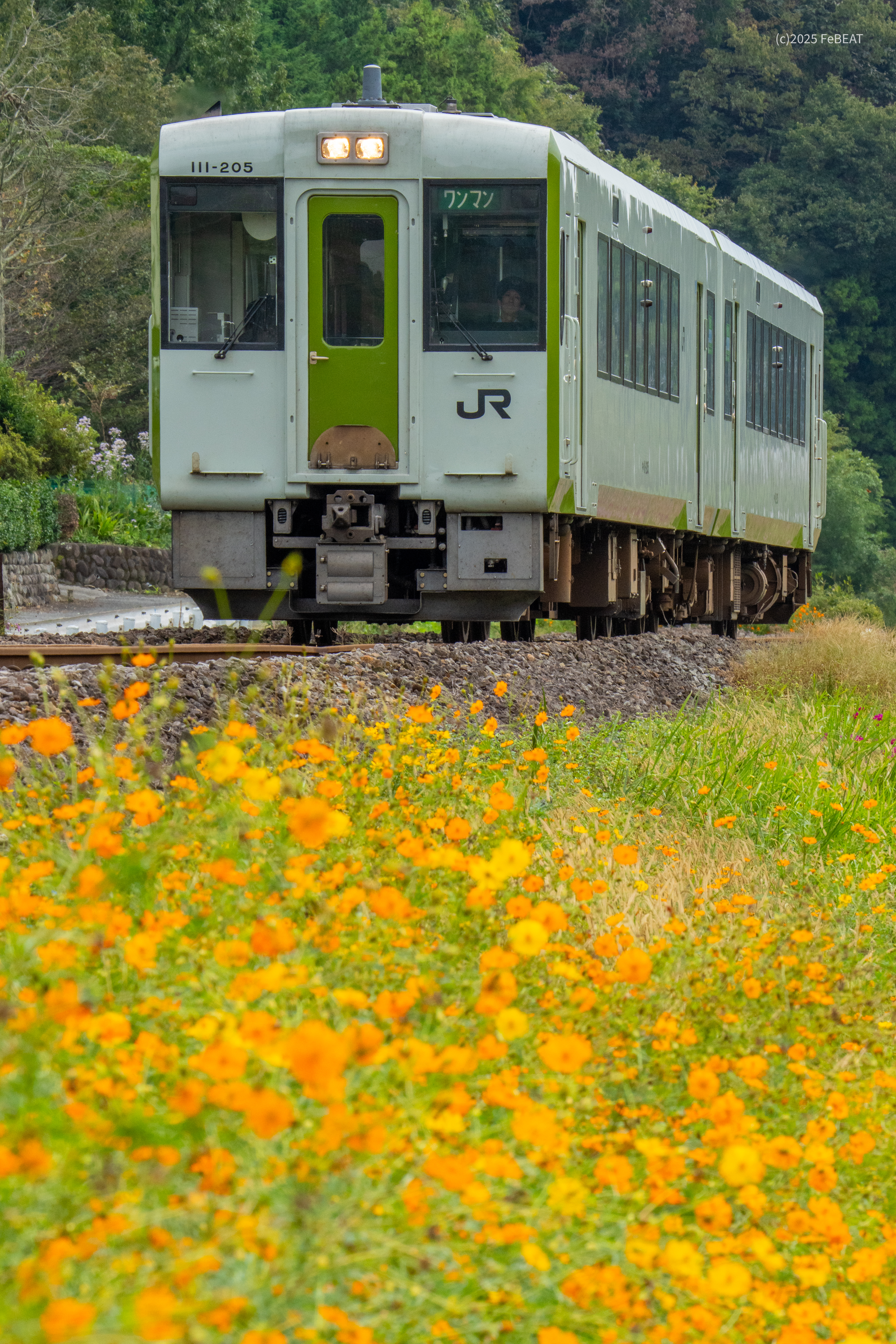 コスモスと列車のバランス、花のかかり具合に悩みながら撮影しました。