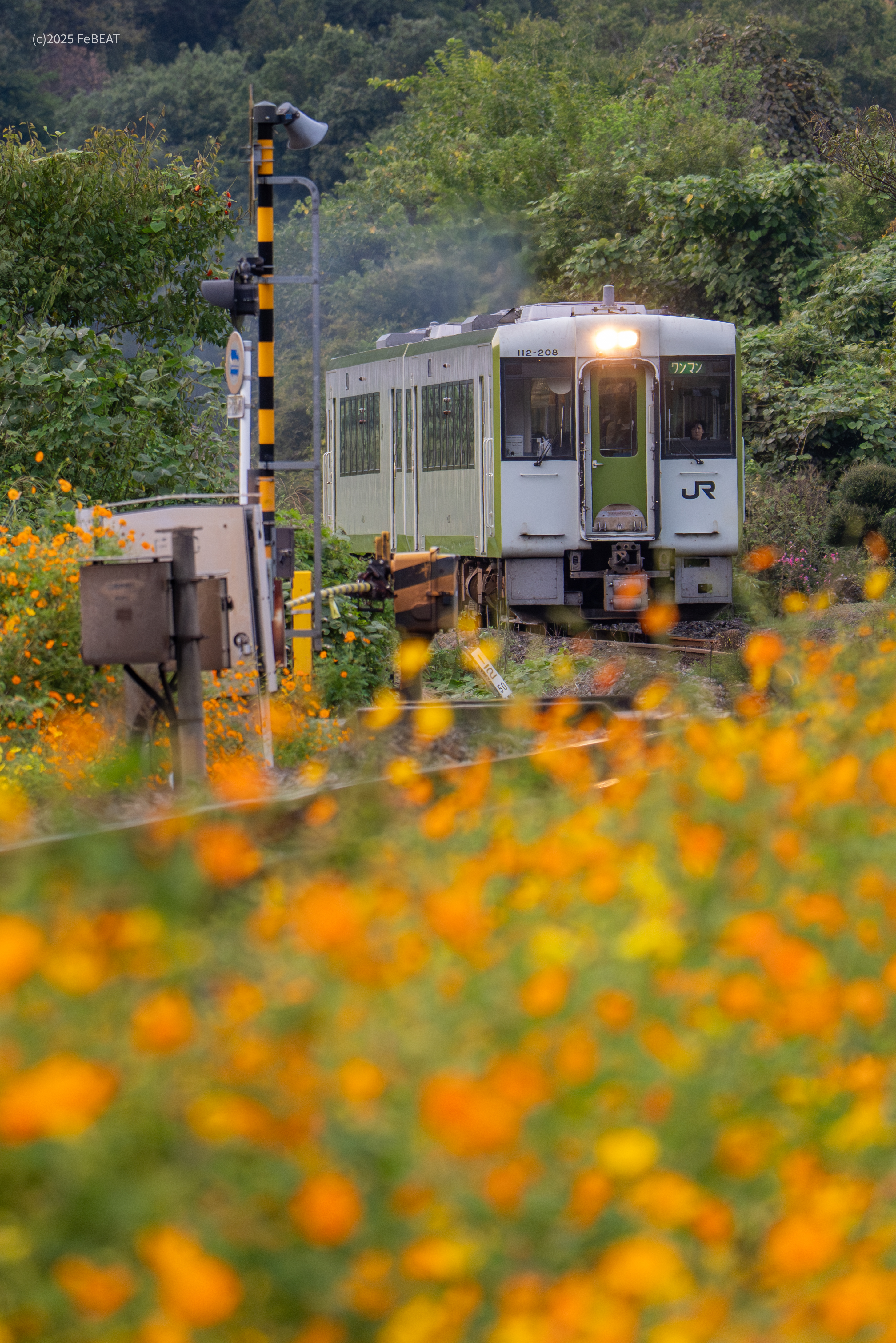 色とりどりのコスモスが線路を飾ります