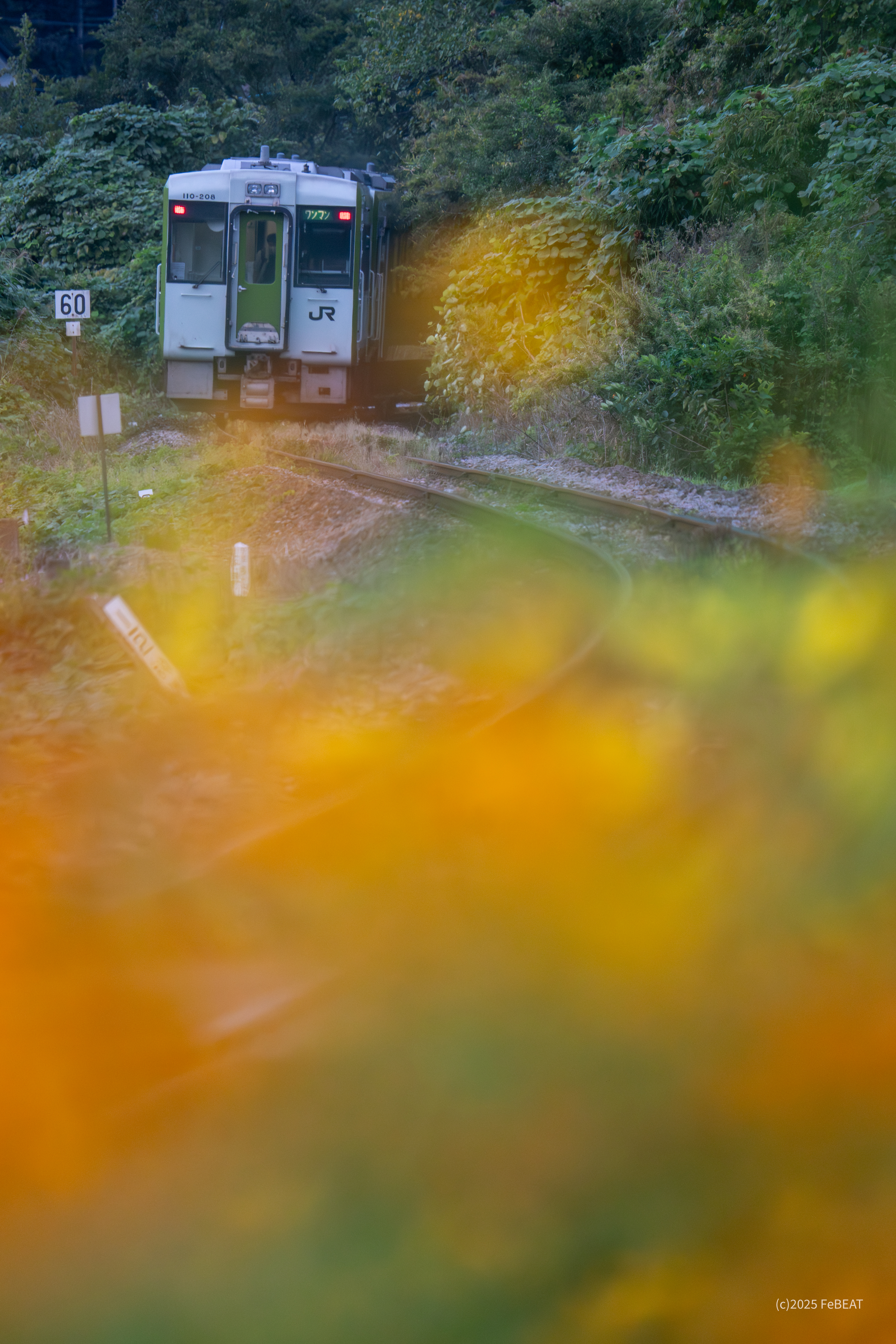 キバナコスモスが揺れる先を列車が走り抜けます。
