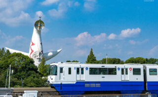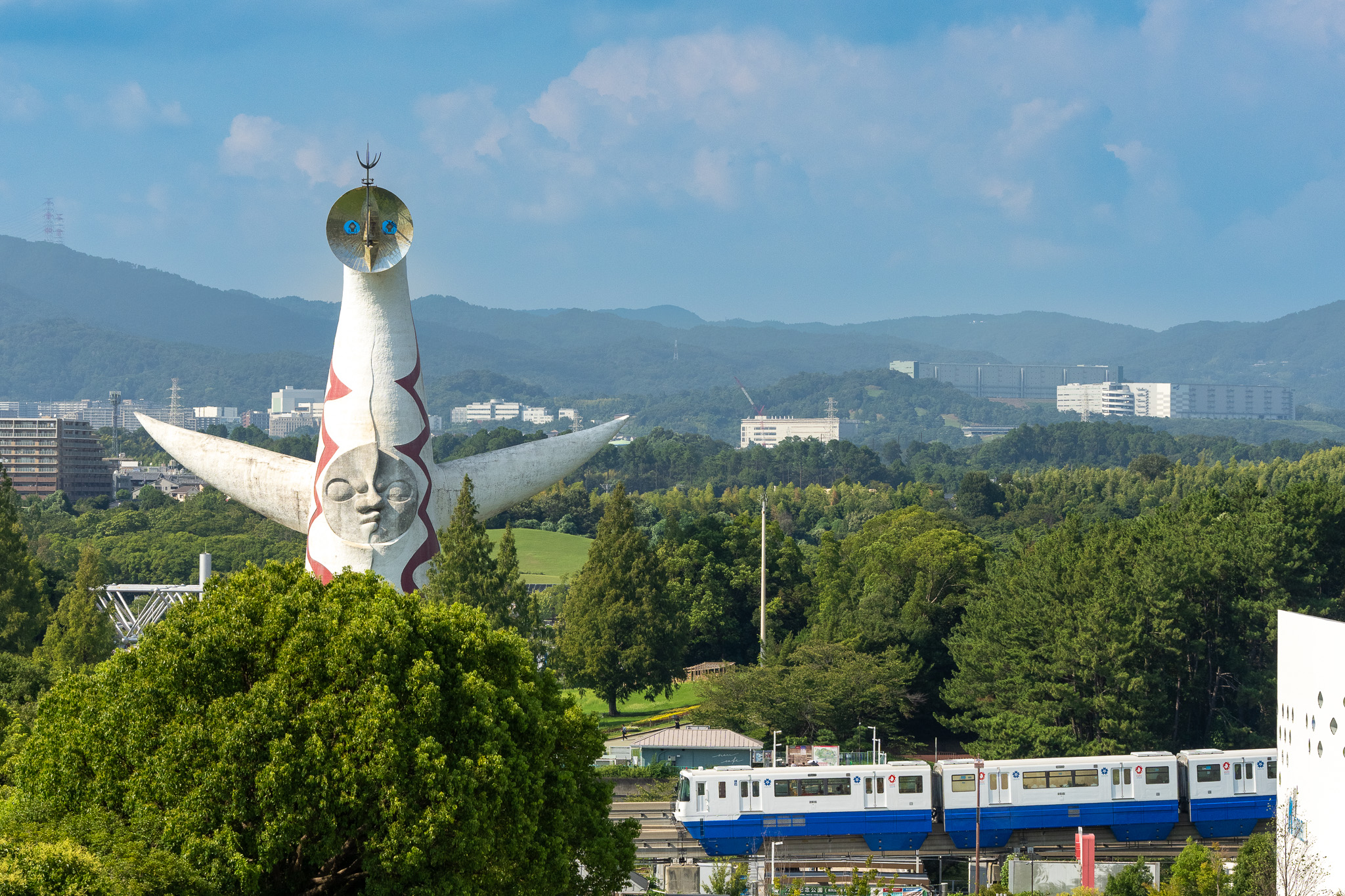 かつての万博会場は公園とショッピングモールに。立ち並ぶパビリオンこそ姿を消しましたが、当時の万博会場内を走っていた白と青のモノレールと太陽の塔が、かつての風景を今に残します。