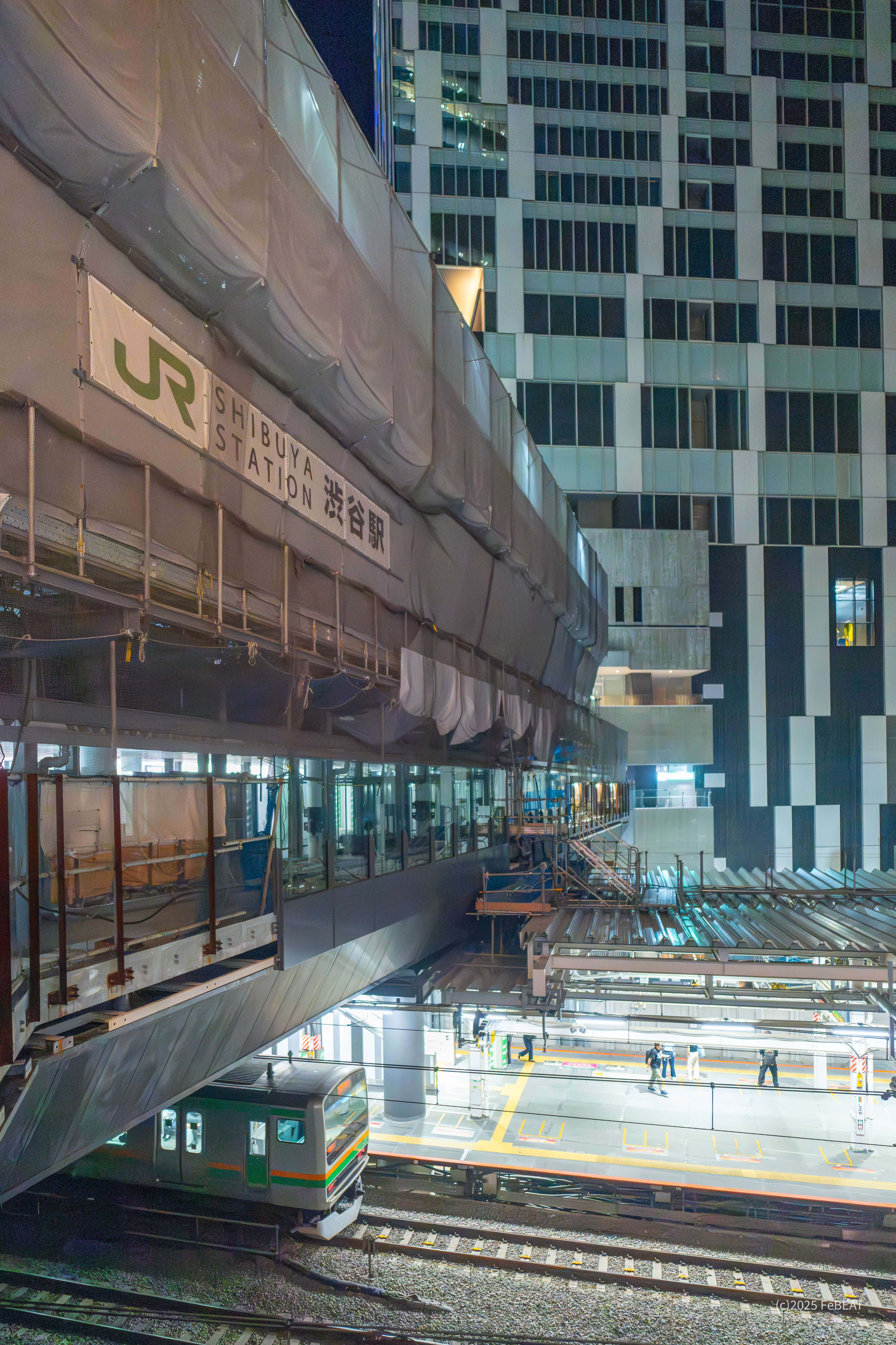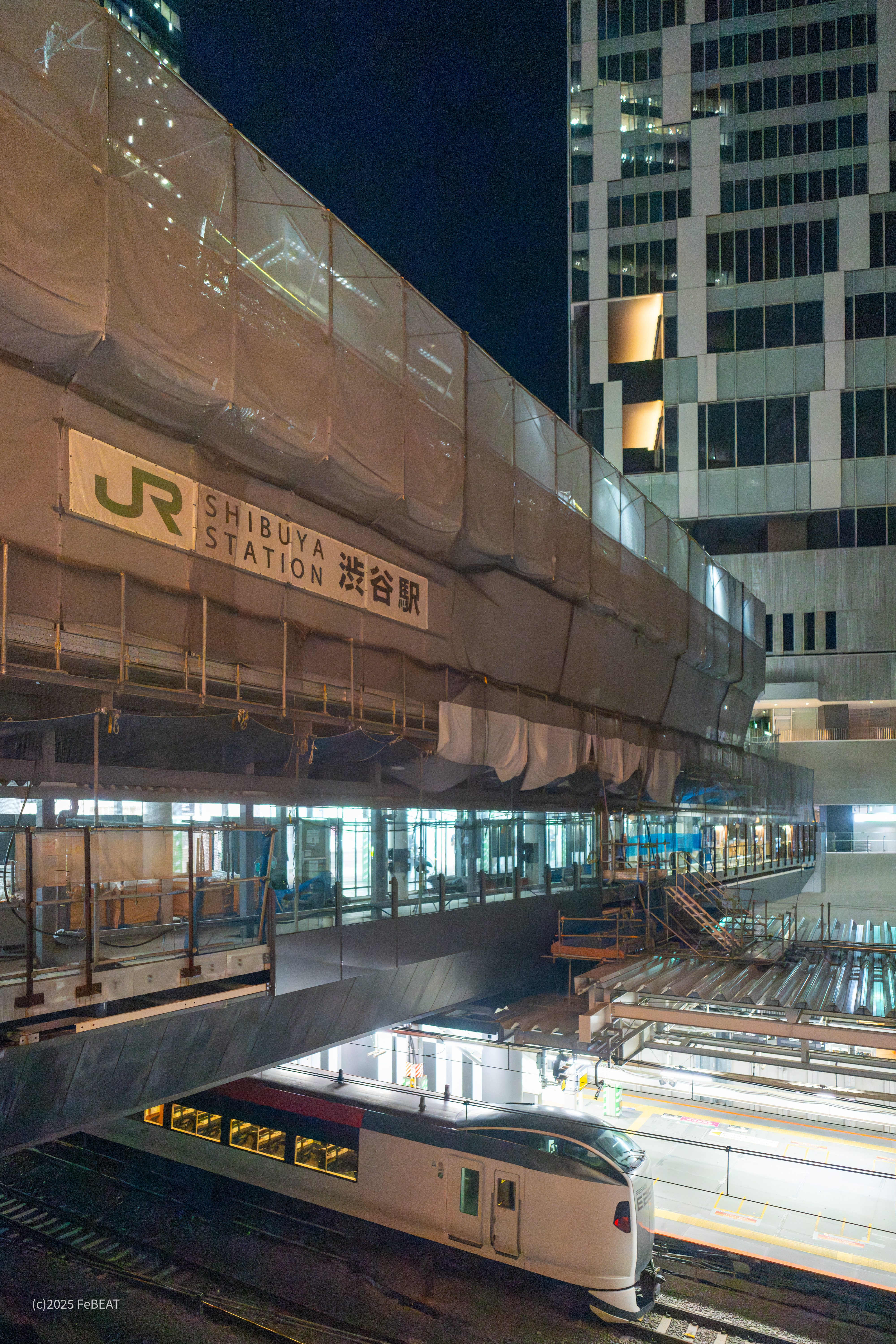 仮設資材に囲まれた通路と、括り付けられた布製の駅名標。再開発の渋谷駅を列車が行き交います。